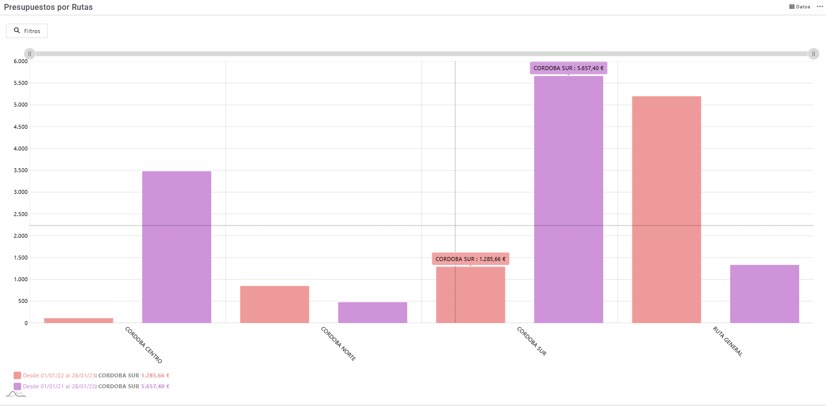 Importe de ventas agrupadas por ruta diferenciando entre el periodo actual y el periodo anterior configurados en la aplicación. En está opción podremos realizar filtros sobre la información que nos muestra estos filtros pueden ser: