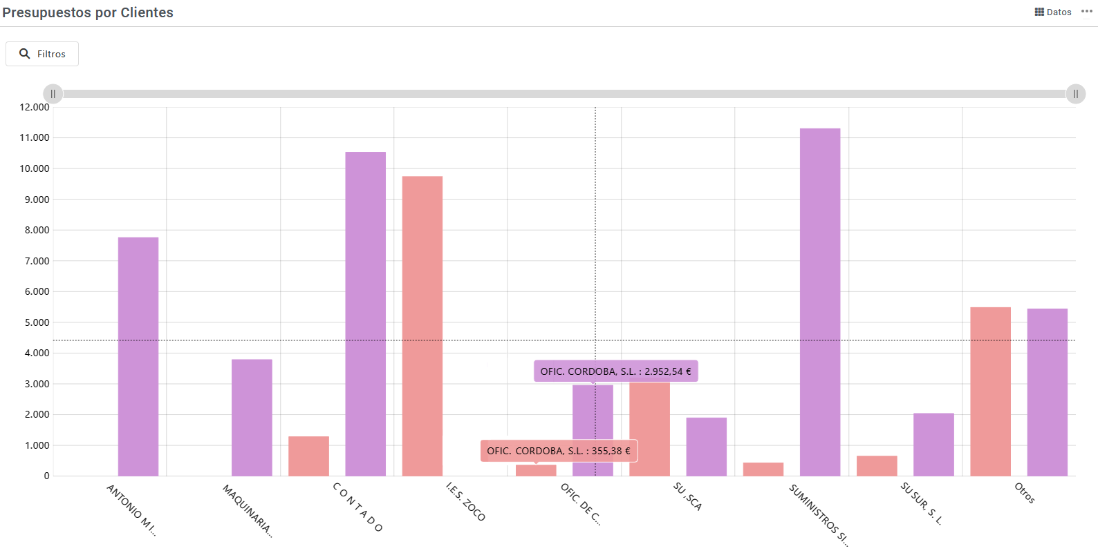 Importe total de los presupuestos de venta en curso agrupados por agente del periodo actual. Esta gráfica muestra una comparativa con respecto al periodo anterior. Se entiende por presupuesto en curso presupuesto con estado 1 y que no cumpla algunas de las siguientes condiciones:
