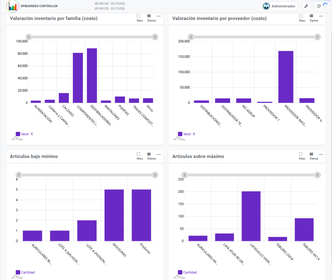 Información referente a los artículos que tengan configurado un saldo máximo y que el saldo actual haya superado el máximo fijado. El saldo máximo puede fijarlo en la ficha del artículo.