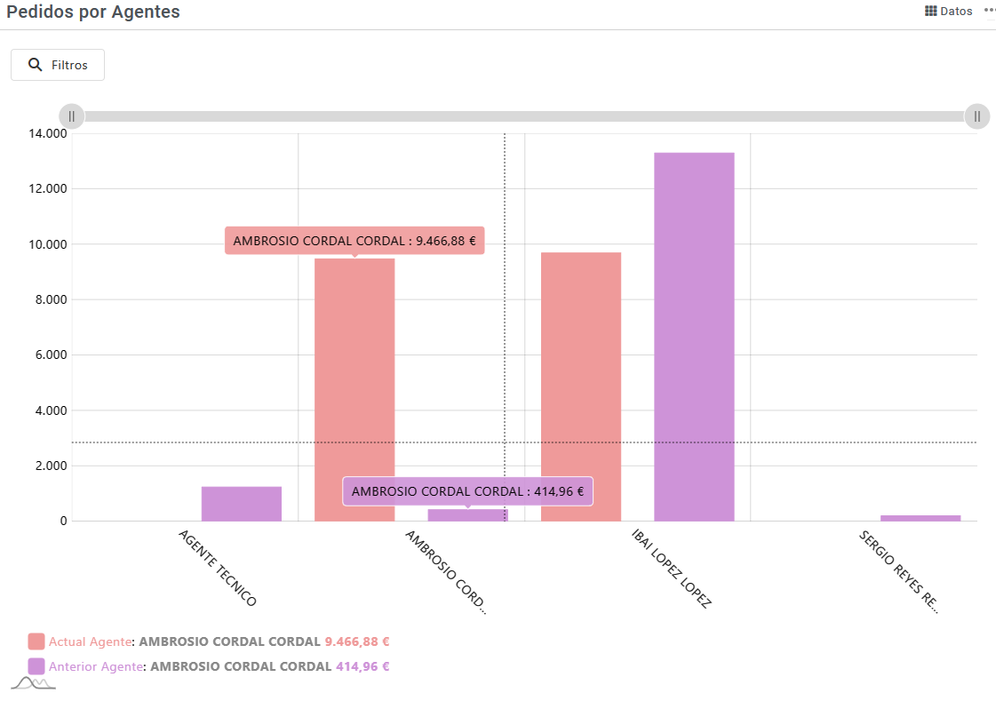 Importe de ventas en pedidos agrupadas por agente diferenciando entre el periodo actual y el periodo anterior configurados en la aplicación. En está opción podremos realizar filtros sobre la información que nos muestra estos filtros pueden ser: