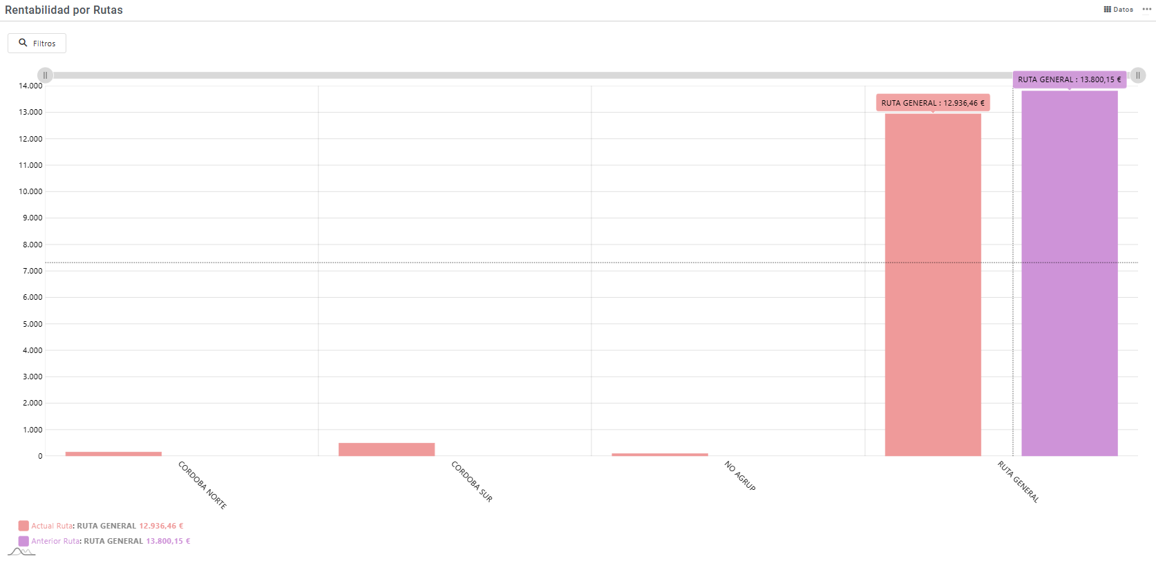 Importe de ventas agrupadas por ruta diferenciando entre el periodo actual y el periodo anterior configurados en la aplicación. En está opción podremos realizar filtros sobre la información que nos muestra estos filtros pueden ser: