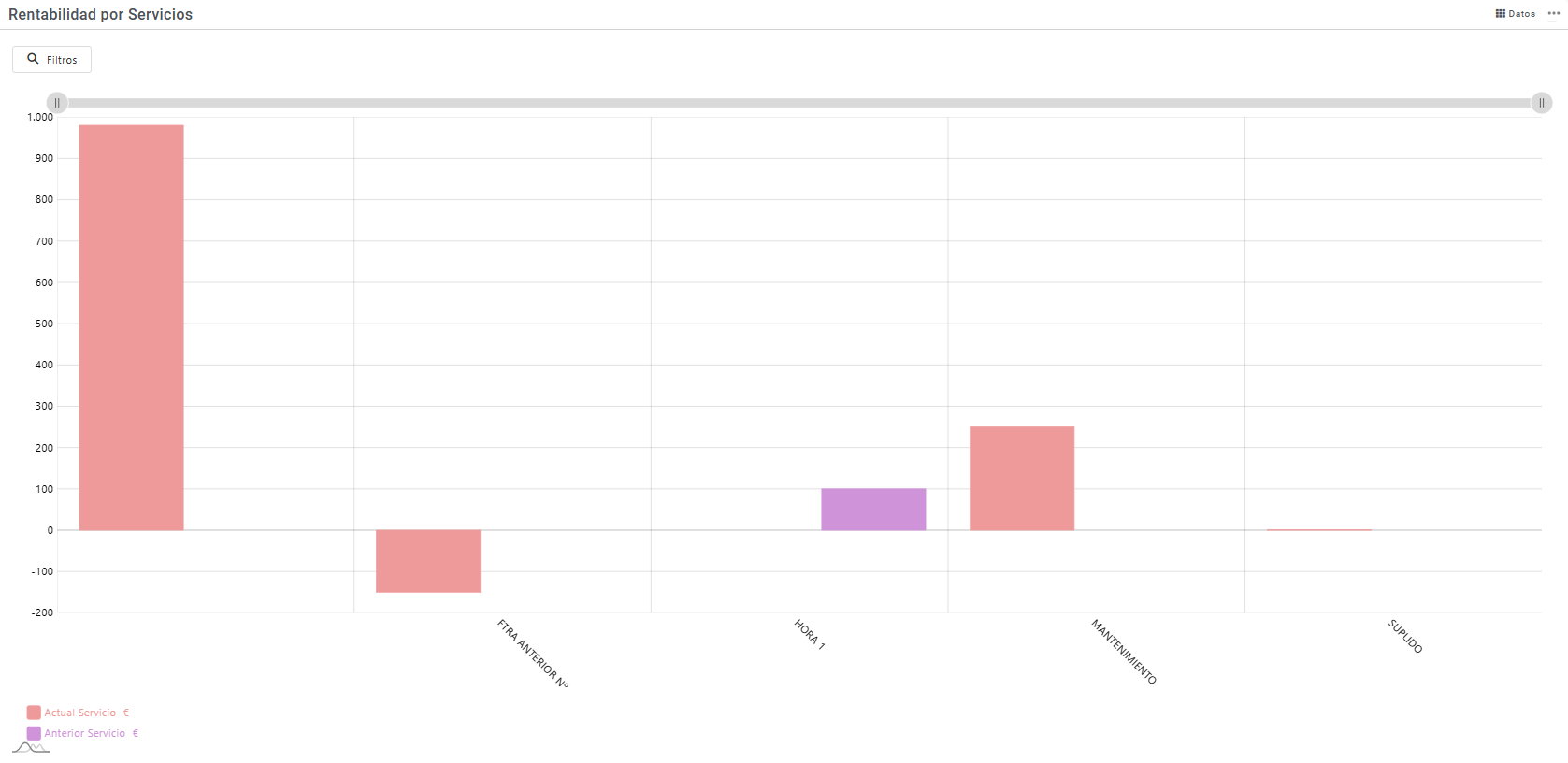 Importe de ventas agrupadas por servicio diferenciando entre el periodo actual y el periodo anterior configurados en la aplicación. En está opción podremos realizar filtros sobre la información que nos muestra estos filtros pueden ser: