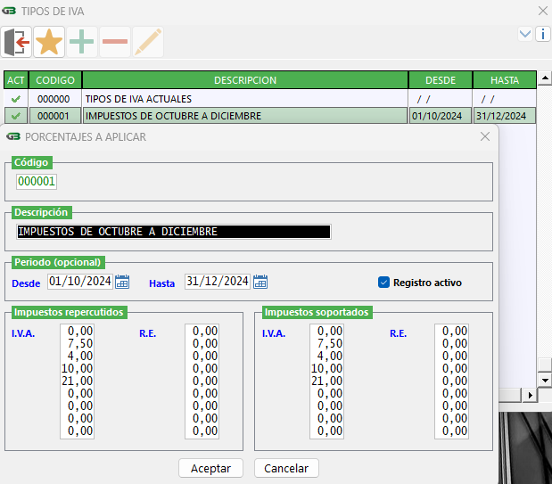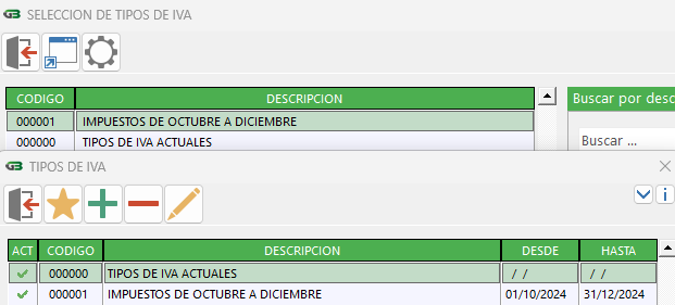 El objetivo de esta opción es modificar los tipos de I.V.A. en la sesión en la que se encuentre, sin tener que cambiar nada en el mantenimiento de empresas.