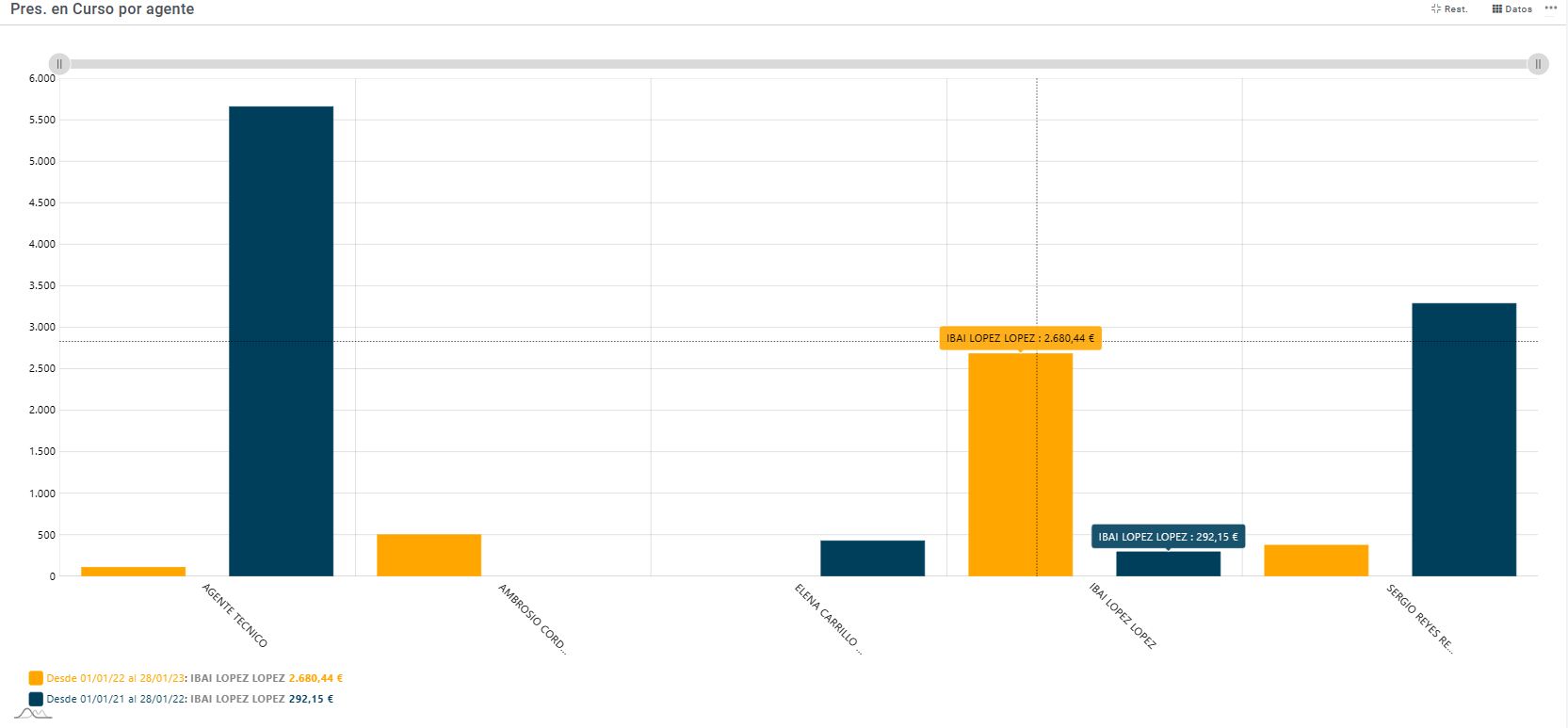 Importe total de los presupuestos de venta en curso agrupados por agente del periodo actual. Esta gráfica muestra una comparativa con respecto al periodo anterior. Se entiende por presupuesto en curso presupuesto con estado 1 y que no cumpla algunas de las siguientes condiciones: