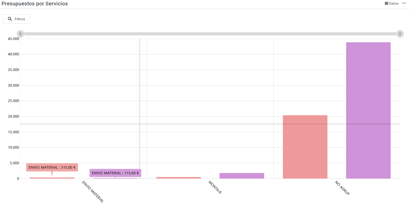 Importe de ventas agrupadas por servicio diferenciando entre el periodo actual y el periodo anterior configurados en la aplicación. En está opción podremos realizar filtros sobre la información que nos muestra estos filtros pueden ser: