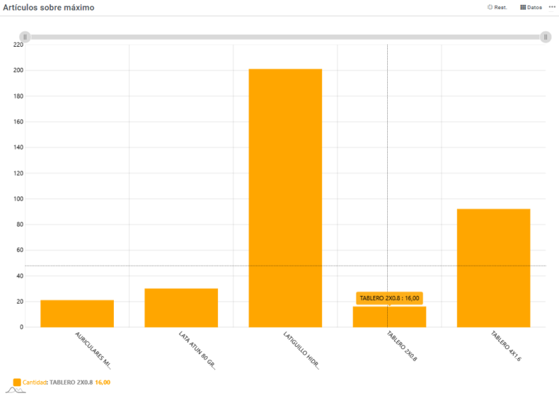Información referente a los artículos que tengan configurado un saldo máximo y que el saldo actual haya superado el máximo fijado. El saldo máximo puede fijarlo en la ficha del artículo.
