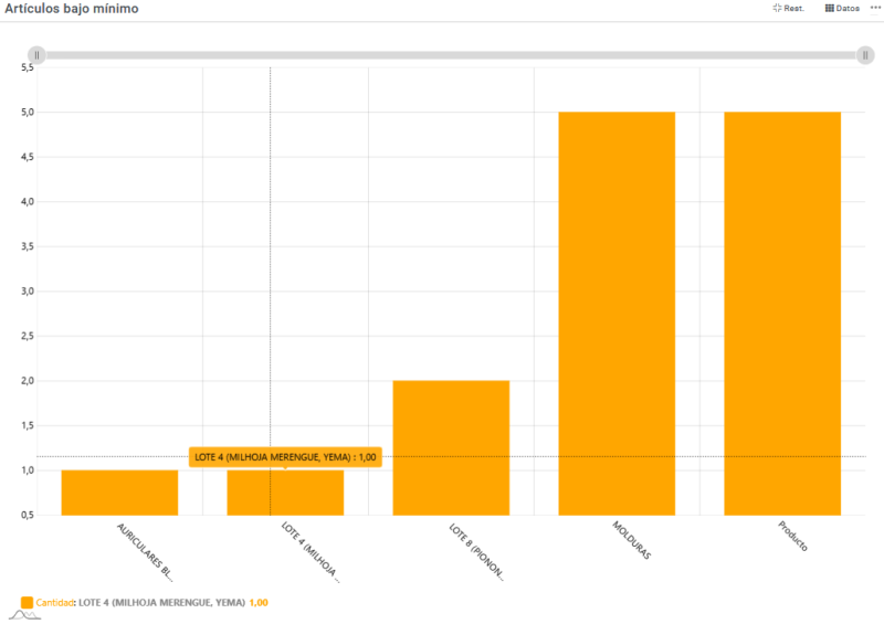 Información referente a los artículos configurados con un saldo mínimo y que el saldo actual haya superado el mínimo fijado. El saldo mínimo puede fijarlo en la ficha del artículo.