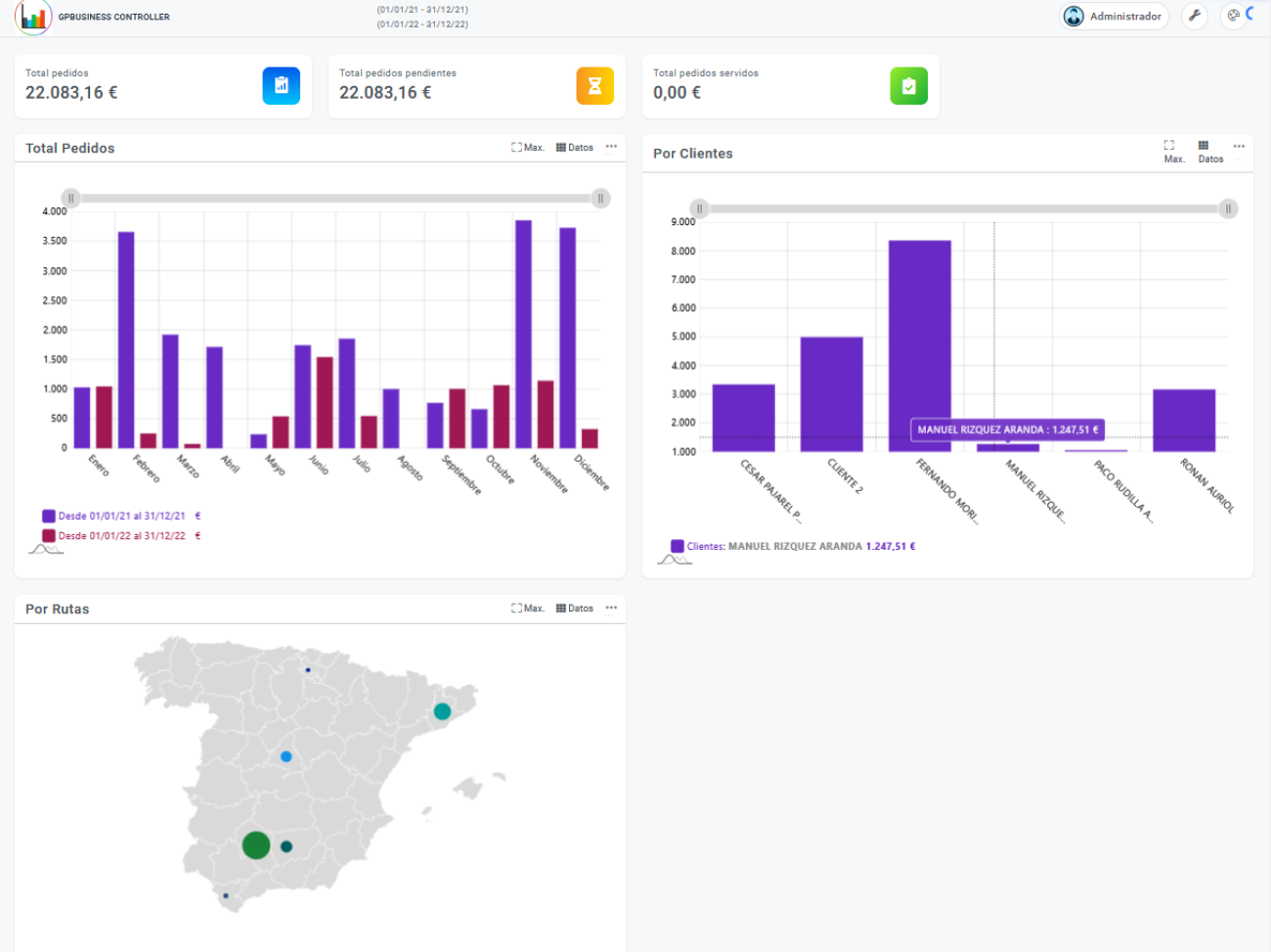 Importe de ventas en pedidos agrupadas por ruta diferenciando entre el periodo actual y el periodo anterior configurados en la aplicación. En está opción podremos realizar filtros sobre la información que nos muestra estos filtros pueden ser:
