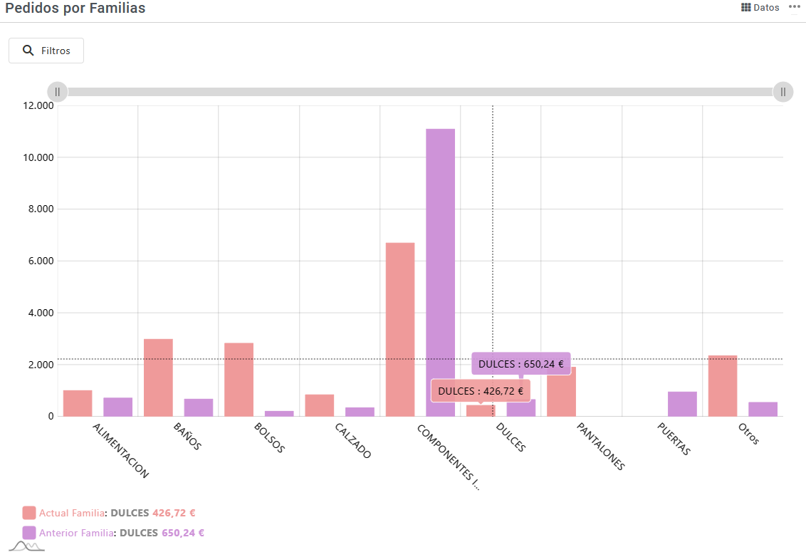 Importe de ventas en pedidos agrupadas por familia diferenciando entre el periodo actual y el periodo anterior configurados en la aplicación. En está opción podremos realizar filtros sobre la información que nos muestra estos filtros pueden ser: