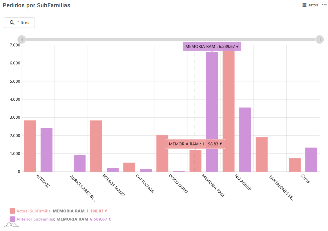 Importe de ventas en pedidos agrupadas por subfamilia diferenciando entre el periodo actual y el periodo anterior configurados en la aplicación. En está opción podremos realizar filtros sobre la información que nos muestra estos filtros pueden ser: