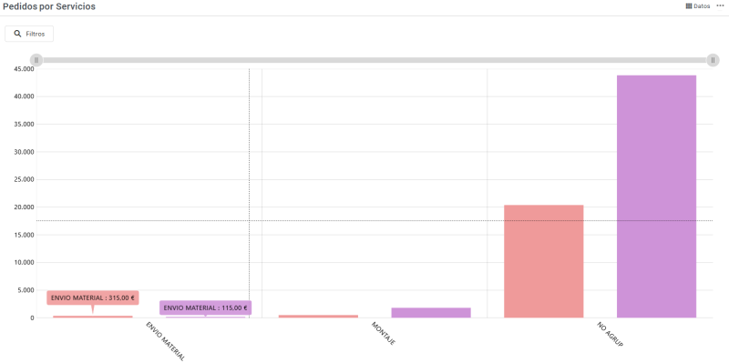 Importe de ventas en pedidos agrupadas por servicio diferenciando entre el periodo actual y el periodo anterior configurados en la aplicación. En está opción podremos realizar filtros sobre la información que nos muestra estos filtros pueden ser: