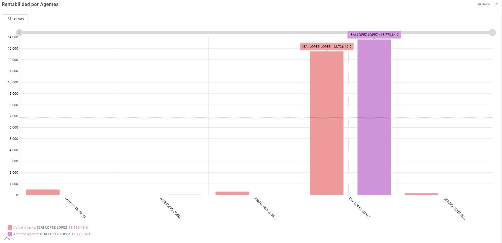 Importe de ventas agrupadas por agente diferenciando entre el periodo actual y el periodo anterior configurados en la aplicación. En está opción podremos realizar filtros sobre la información que nos muestra estos filtros pueden ser: