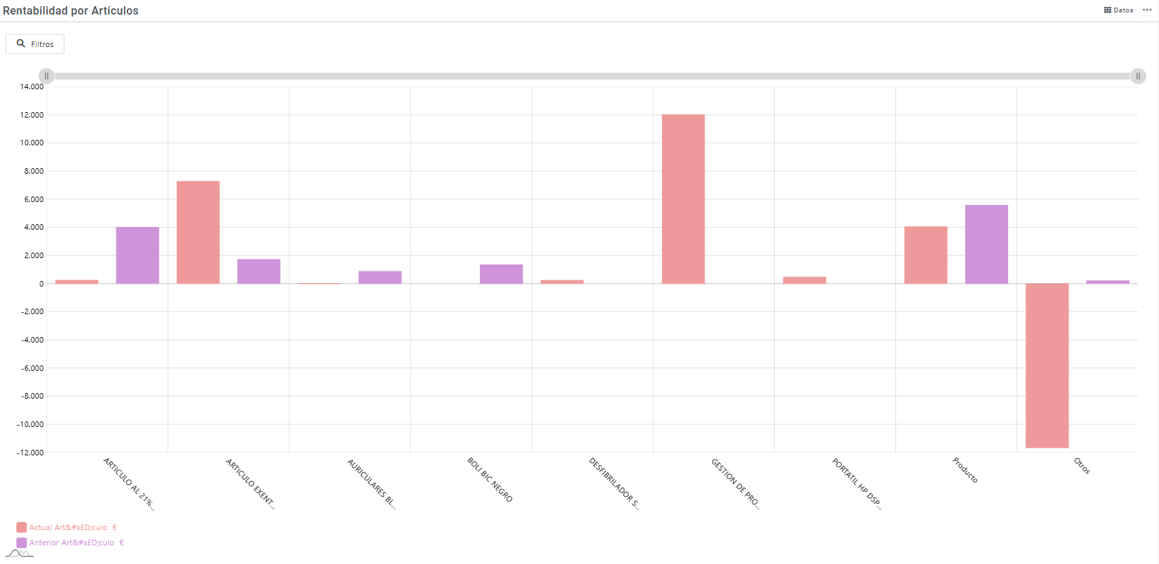 Importe de ventas agrupadas por artículo diferenciando entre el periodo actual y el periodo anterior configurados en la aplicación. En está opción podremos realizar filtros sobre la información que nos muestra estos filtros pueden ser: