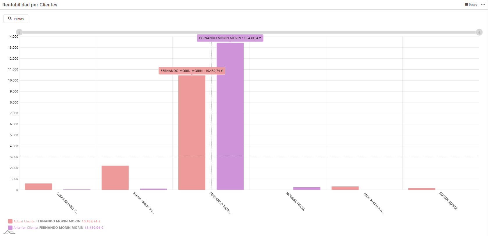 Importe de ventas agrupadas por cliente diferenciando entre el periodo actual y el periodo anterior configurados en la aplicación. En está opción podremos realizar filtros sobre la información que nos muestra estos filtros pueden ser: