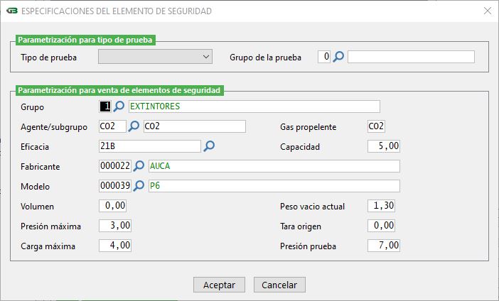 | Presión prueba | Introduzca la presión de prueba que se volcará en el elemento de seguridad al realizar una compra, de no utilizarse dejar a cero. |