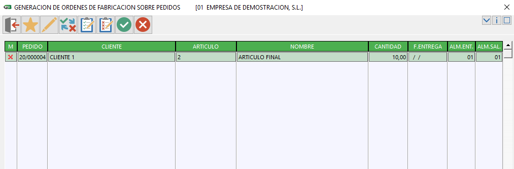 ) no se generará en ninguna orden de fabricación. - Pedido: número de pedido en el que se ha incluido el artículo a fabricar.