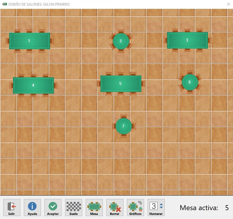 En esta opción se define de manera gráfica la composición del salón activo. Definiendo el número, la disposición y tipo de mesas, así como el tipo de suelo y la inclusión de varios tipos de adornos. A continuación se muestra un ejemplo de diseño, junto a la descripción de los botones: