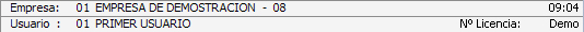 Terminando la descripción del panel principal, encontrará en la parte inferior de la ventana una barra de estado en la que puede observar el número de la empresa activa, el usuario trabajando, la hora y el número de licencia de su aplicación.