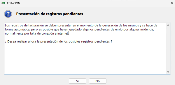 Imprimir × Presentación de registros pendientes Los registros de facturación se envían automáticamente al generarse, pero algunos pueden quedar pendientes si hay problemas como falta de conexión a internet. Con esta opción, podemos revisar y enviar los registros que aún no se han procesado.